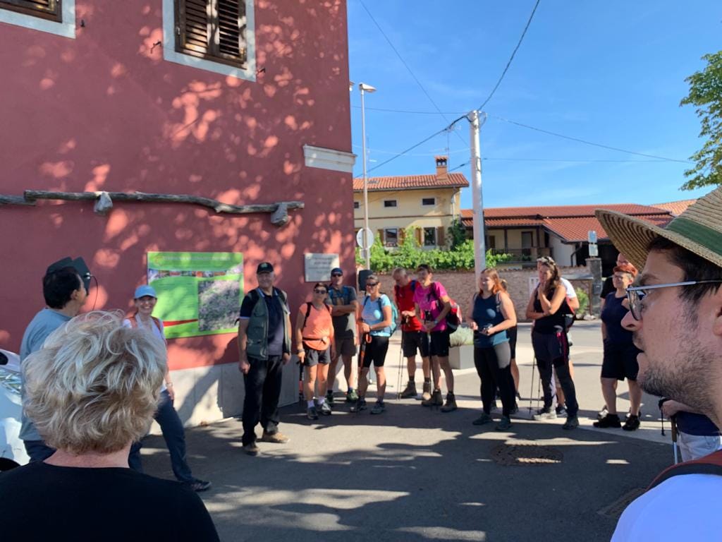 Osrednji vaški prostor “Plac” v Dutovljah je bil izhodišče tako za pohodnike, ki so startali na vodeni pohod po Teranovi krožni poti pred Bunčetovo domačijo že ob 9. uri. Program pohoda: H nogam na teran in pršut, v organizaciji Društva turističnih vodnikov Krasa in Brkinov je združeval kulturne utrinke Dutovelj z ogledom spominske sobe Borisa Pahorja in Pepinega vrta, nekaj še ohranjenih arhitekturnih biserov vasi in postankom pri vinarju Šucu (fotografije: @visitkras, @FB teraninprsut.si, @drustvo vencek).