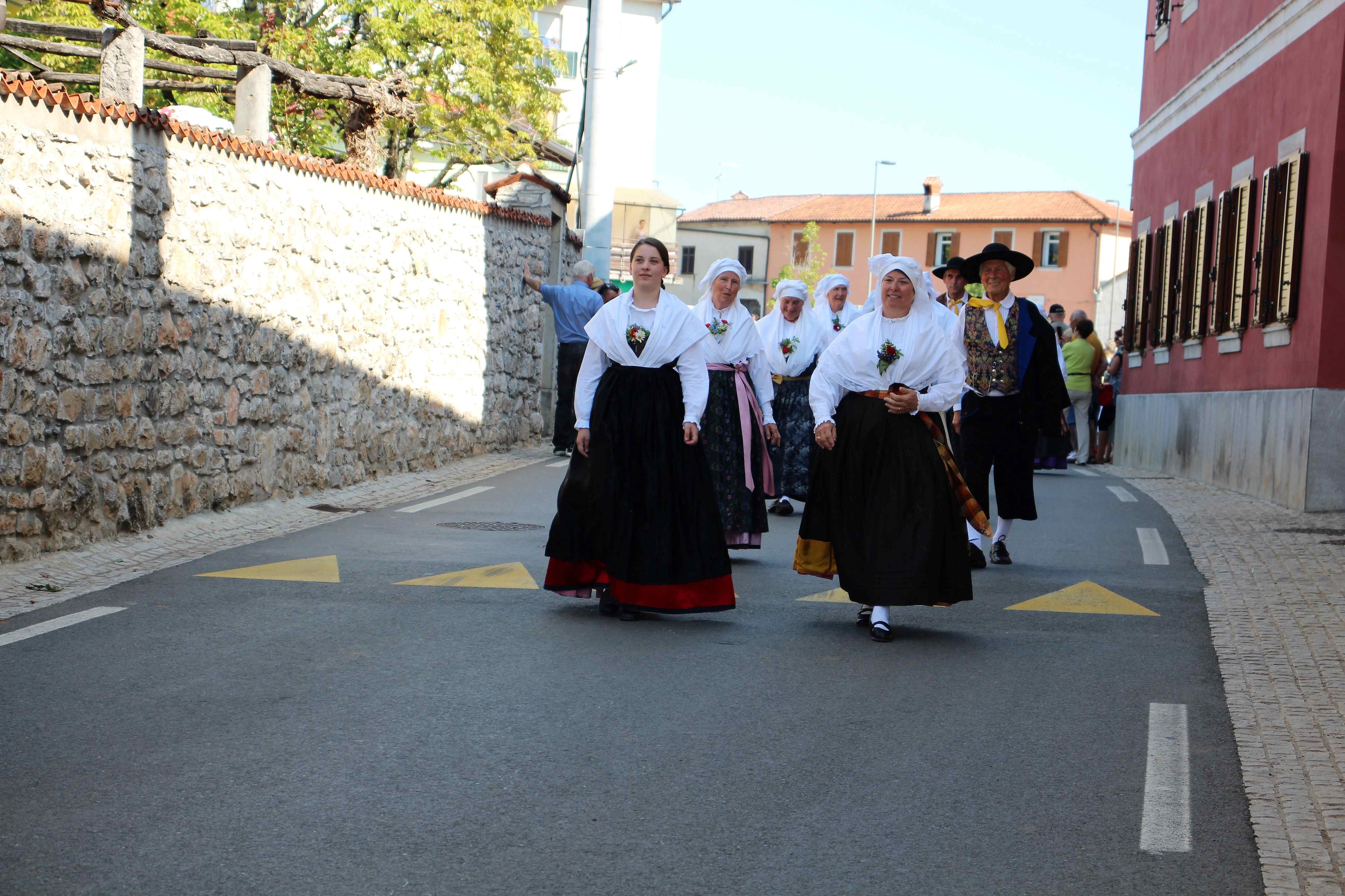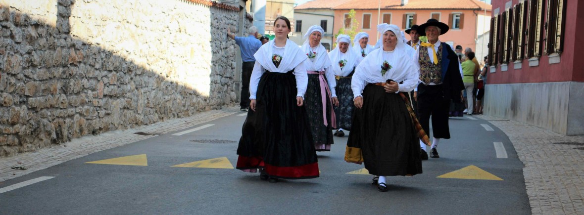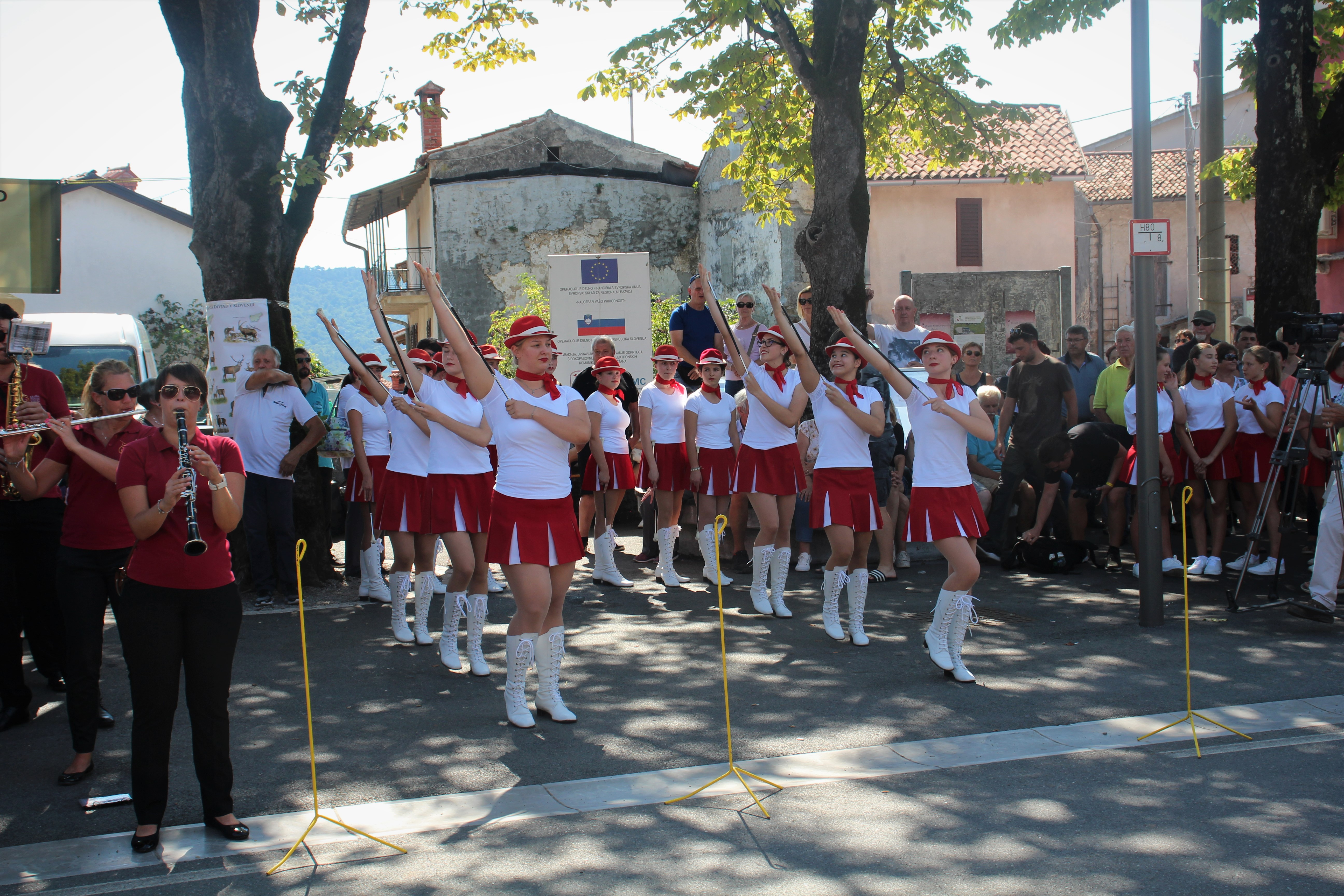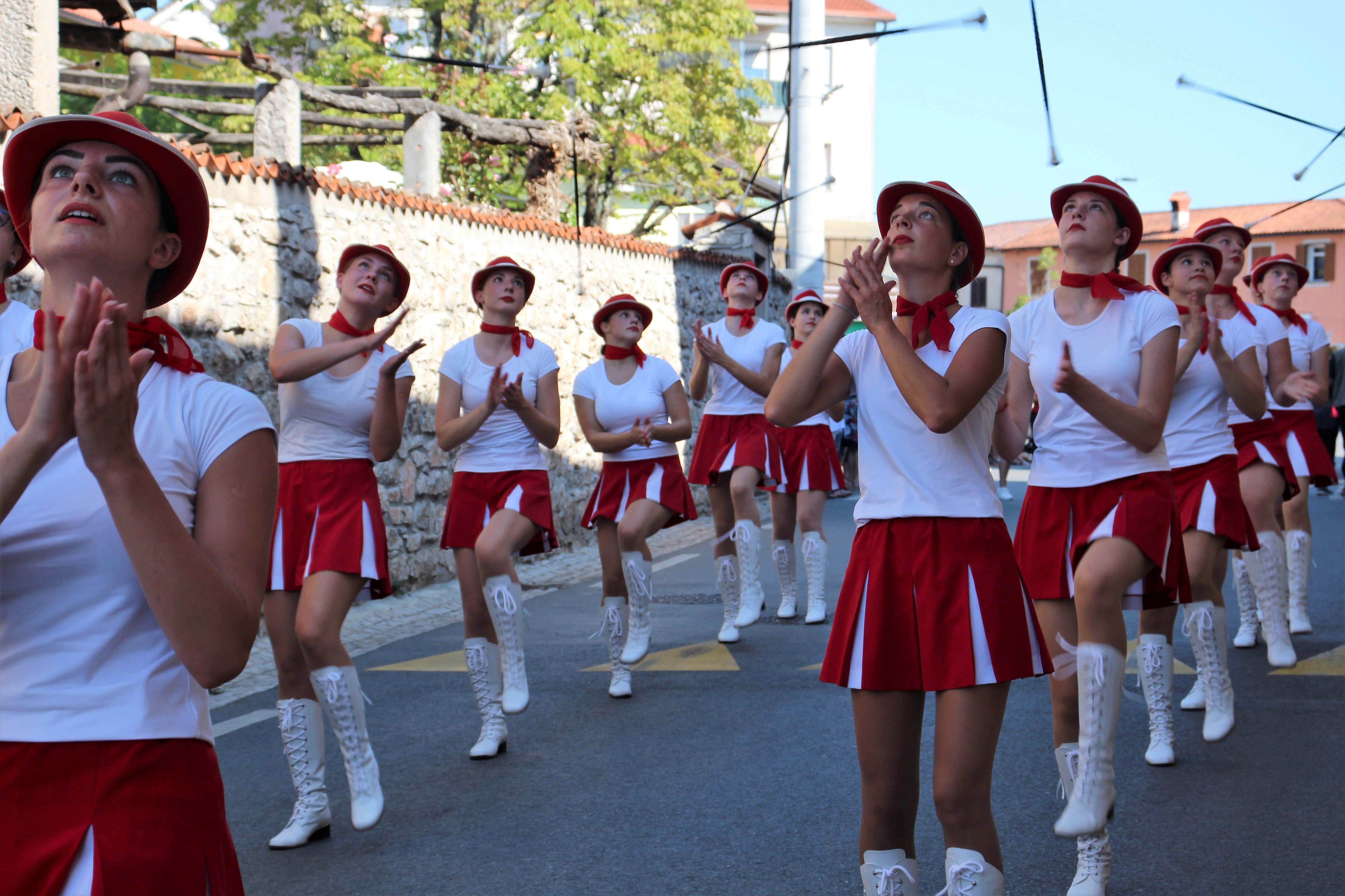 Vrhunec družinske nedelje v Dutovljah je predstavljala Povorka s pričetkom na “Placu” v Dutovljah. Godbeni pozdrav je tradicionalno prispevala Kraška pihalna godba in Mažoretke iz Povirja (@fotografije: društvo Venček).