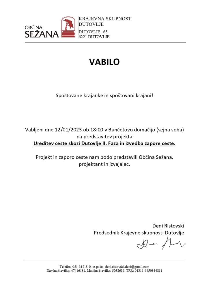 V četrtek 12.1.2023 bo potekala predstavitev glede zapore ceste v Dutovljah