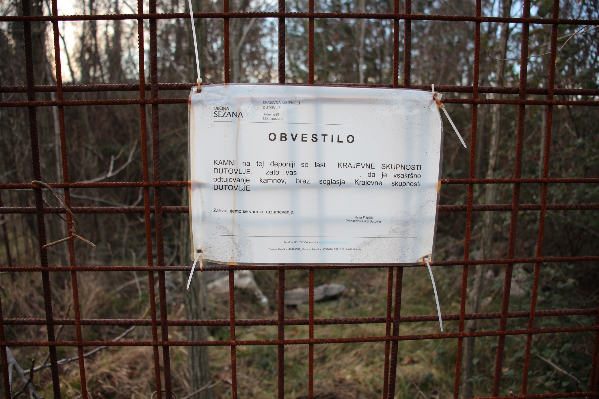 Mesto deponije smo obiskali takoj naslednji dan, v nedeljo in pričakala nas je žalostna podoba. V mreži je luknja, kar kaže na zelo verjetno krajo kamnov. O dogodku smo pisno obvestili predsednika Krajevne skupnosti Dutovlje.