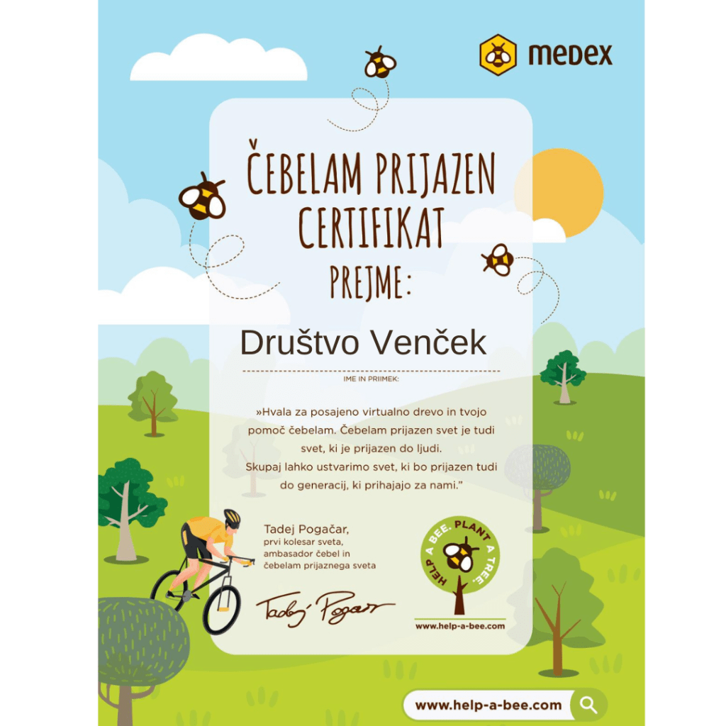 Društvo Venček se je ob svetovnem dnevu čebel odzvalo pobudi našega kolesarja Tadeja Pogačarja in podjetja Medex: Posadi drevo, da čebelam bo lepo. Posadili smo virtualna medovita drevesa in prispevali v sklad za pogozdovanje. Za sodelovaje na projektu smo prejeli certifikat čebelam prijaznih prijateljev. Leto 2022 je evropsko leto mladih, zato je glavna tema letošnje obeležitve svetovnega dneva čebel: mladi in čebelarstvo. Naš skupen moto je: “Skupaj lahko ustvarimo svet, ki bo prijazen tudi do generacij, ki prihajajo za nami.”