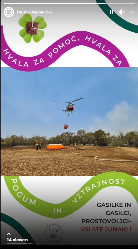 Kulturno-razvojno društvo Venček se je pridružilo vseslovenski akciji v podporo gasilcem na Krasu z deljenjem vsebin na Facebooku. Objavili smo 20 različnih zgodb in več objav na profilu Društva Venček. Gasilce, vojake, prostovoljce smo vsak dan spodbujali, jim želeli srečo in se jim zahvalili za vsak napor. Opravili so izjemno delo in rešili Kras pred naravno katastrofo. ŠE ENKRAT: VELIK HVALA!