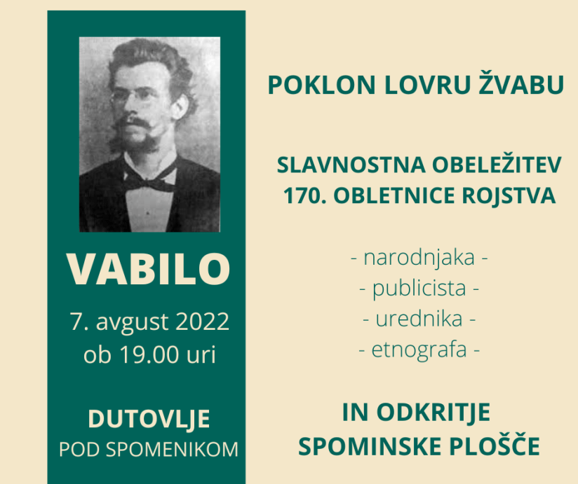 Kulturno-razvojno društvo Venček vabi na kulturni dogodek ob 170. obletnici rojstva našega rojaka in vaščana Lovra Žvaba, v nedeljo 7. avgusta 2022 ob 19.oo uri, v Dutovljah, pod spomenikom. Ob tej priložnosti bomo odkrili spominsko ploščo, v počastitev in zahvalo njegovim prizadevanjem za ohranitev ljudskega izročila Dutovelj in Krasa. Zaslužen je za izjemen prispevek k ustanovitvi prvega slovenskega vrtca in slovenske šole v Trstu. Več informacij o dogodku je dostopnih na tej spletni povezavi.