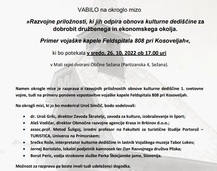 26. oktobra 2022, ob 17.00 uri bo v Mali sejni dvorani na Občini Sežana, v organizaciji ORA, potekala okrogla miza o nameri rekonstrukcije vojaške kapelice v Kosoveljah. VSTOP PROST.