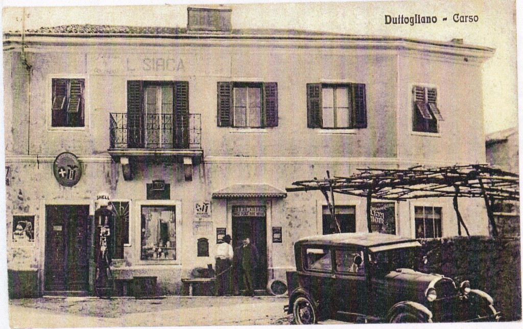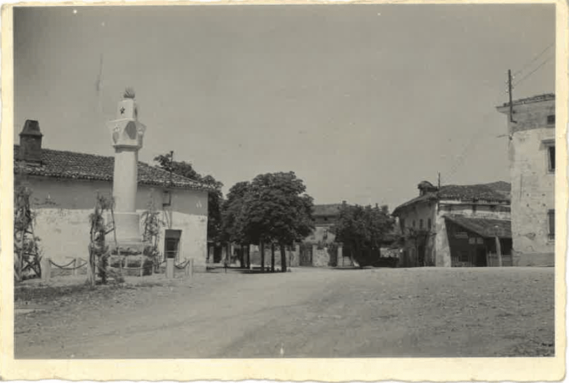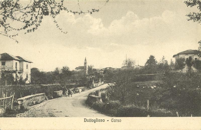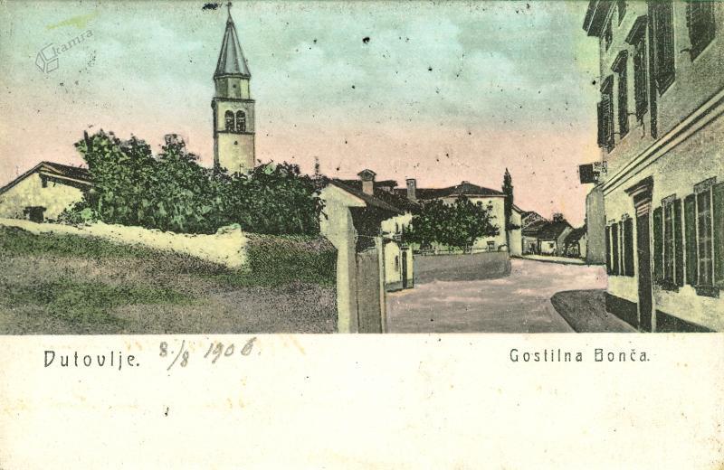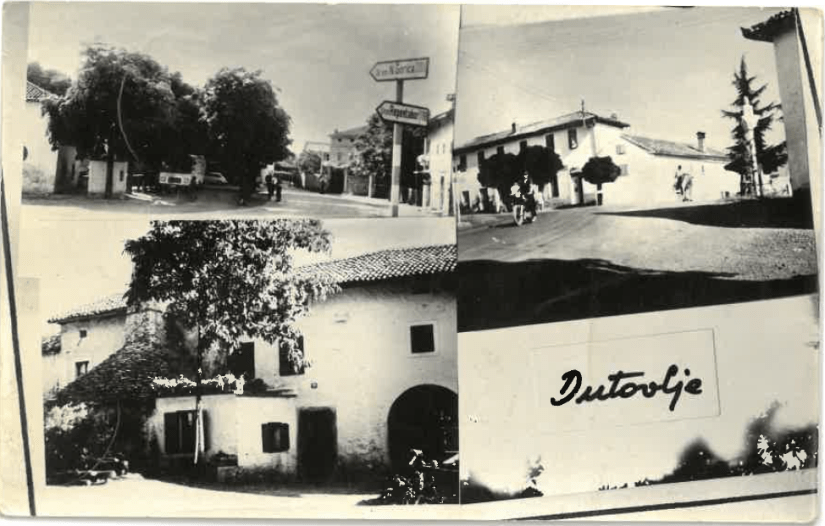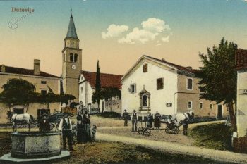 Uvodna razglednica iz leta 1910, prikazuje vaški trg v Dutovljah v smeri proti Sežani in vaško ‘štirno’ v ospredju, ki je bila takrat glavni vir pitne vode. Verjetno je bila skupna štirna, saj je stala “Na placu” do konca prve svetovne vojne. Stavba ob cerkvi je kaplanija, ki je služila kot šolsko poslopje do požiga leta 1929. Na zatrepu poslopja je kapelica. Po požigu so ruševine odstranili in uredili park s kapelico. Skrajno desno je smerokaz za Trst na pročelju hiše. Trst je bil pomembna trgovska destinacija za domačine, ki so tja vozili svoje pridelke. Ob cesti Dutovlje–Kreplje so se tudi odvijali živinski sejmi. V ozadju je cerkev sv. Jurija. Tržaški zgodovinarji pišejo, da so bili v Dutovljah templarji in so imeli ob cerkvi samostan. Cerkveni templarski viteški red je deloval od 1119 do 1312. Nadzorovali so trgovske poti. V srednjem veku je bila cerkev obdana z mogočnim obzidjem in obrambnimi stolpi. Ti so bili še v 19. stoletju kriti s korci, razen enega na vzhodni strani so ostale podrli leta 1823. Zadnjega so porušili leta 1910. V notranjosti obzidja je bilo tudi pokopališče. Obzidje je skrivalo več čudnih napisov, ki jih zgodovinarji niso znali prebrati. V začetku 20. stoletja je bil v obzidje vzidan rimski napis. Ni znano kje je končal. Da je skozi vas tekla pomembna prometnica priča tudi srednjeveška mitnica, ki je v letu 2018 nesrečno porušena.