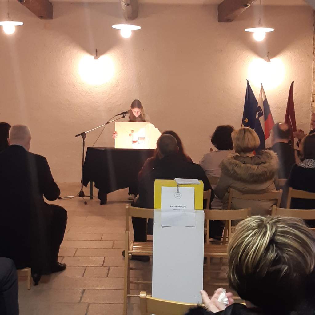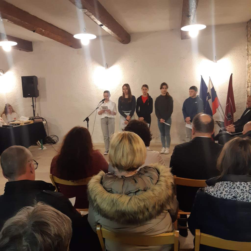 Mladi recitatorji OŠ Dutovlje so s svojo otroško iskrivostjo povedali, da je Srečkova beseda še kako živa. Prikazali so nam tudi kamišibaj, izraz njihove domišljije in ustvarjalnosti.