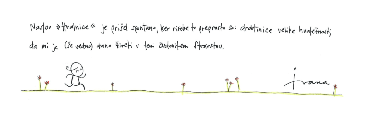Kulturni program je spremljala tudi otvoritev razstave “Hvalnice” ilustratorke Ivane Žigon. Ivana žigon riše z barvicami ali akvarelnimi barvicami na navadne liste A4 format.