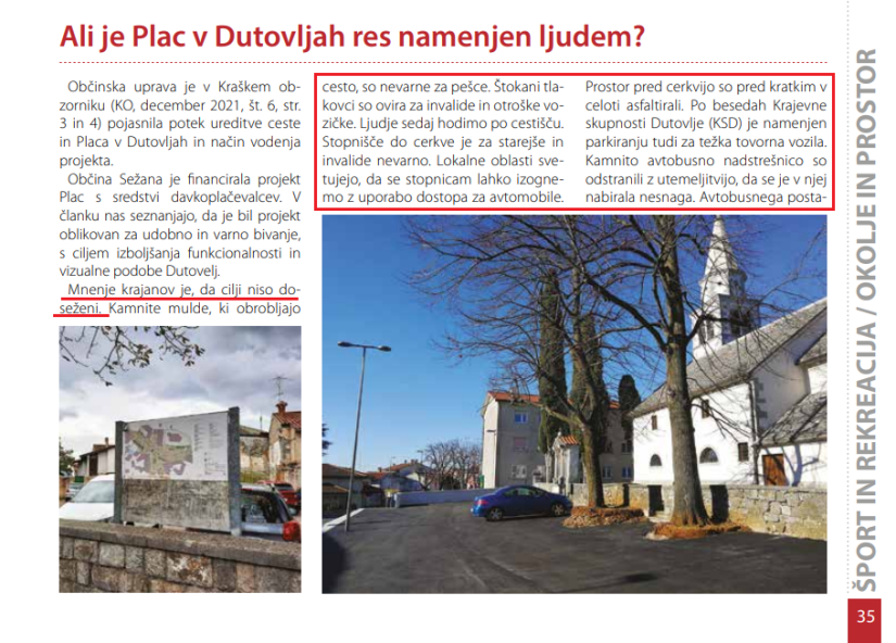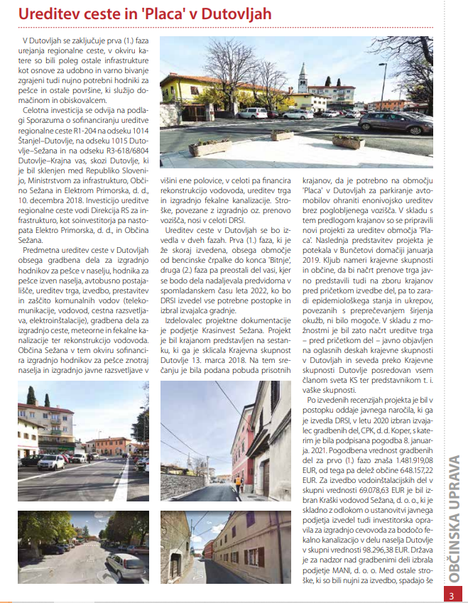Nova ureditev “Placa v Dutovljah” v letu 2021 nam je prinesla veliko. Nov asfalt, nove zidove, nove stopnice in bogato nočno osvetlitev. Menda naj bi s prenovo osrednjega javnega prostora “Plac”, vsak našel kaj lepega zase.