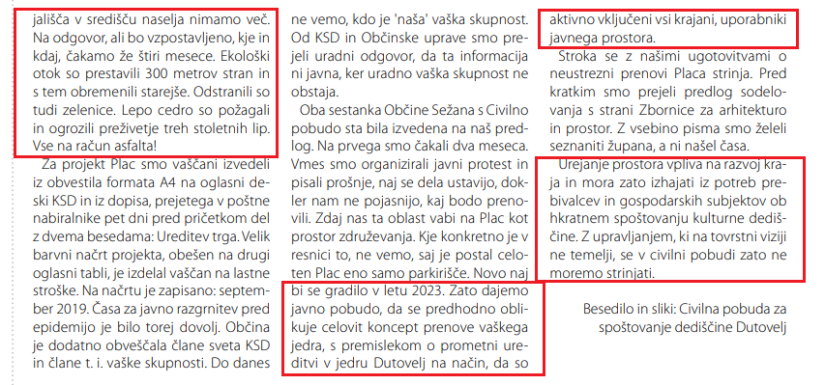 Člani civilne pobude smo v letu 2021 vložili več kot 2.500 ur prostega časa, da bi sploh ugotovili, kako se nam je zgodila mimobežna prenova “Placa”. Iskali smo odgovore na zastavljena vprašanja, ki jih od odgovornih nismo prejeli. Ugotovili smo veliko. Kršili so se zakoni v postopkih izvedbe projekta in občinski prostorski načrt. Vendar nismo uspeli z uradno potrditvijo niti ene kršitve. Vse pristojne javne inštitucije in inšpekcije, ki so ustanovljene za namen varovanja javnega interesa in javnih koristi, so se izmuznile skozi šivankino uho pravnih vrzeli. Vse plačane iz javnih sredstev davkoplačevalcev! Zakoni, predpisi in način delovanja nekaterih javnih organov so v naši državi takšni, da papir prenese vse. Kaže, da opustitev dolžnega ravnanja postaja dopustno ravnanje, odgovornost in morala pa nista več vrednoti.