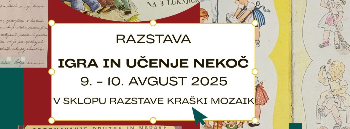 Društvo Venček vas tokrat popelje na potovanje v preteklost! V sklopu razstave Kraški mozaik 53. Praznika terana in pršuta, ki bo potekala v Bunčetovi domačiji v Dutovljah, v soboto 9. in nedeljo 10. avgusta 2025, vas z razstavo “IGRA IN UČENJE NEKOČ” popeljemo skozi otroštvo in šolske klopi od zgodnjega 20. stoletja do prihoda mobilnih telefonov.