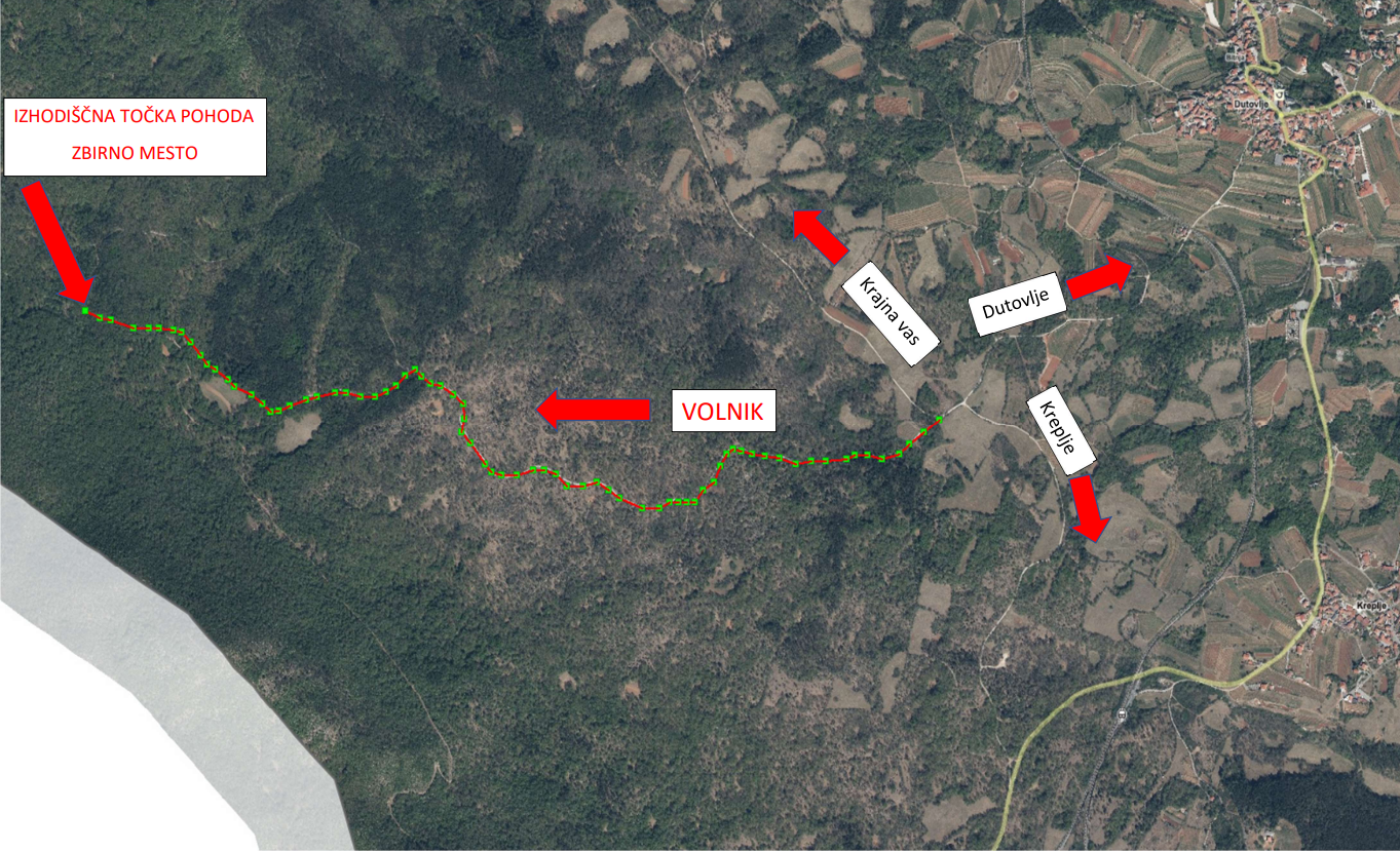 Zbirno mesto je v Dutovljah na placu ob 18.20, od koder se bomo z avti zapeljali do peš izhodišča pod Žekencem (predviden odhod ob 18.30). Spodaj je zemljevid in fotografija izhodiščne točke. Pot je označena. Zemljevid z označbami je spodaj.