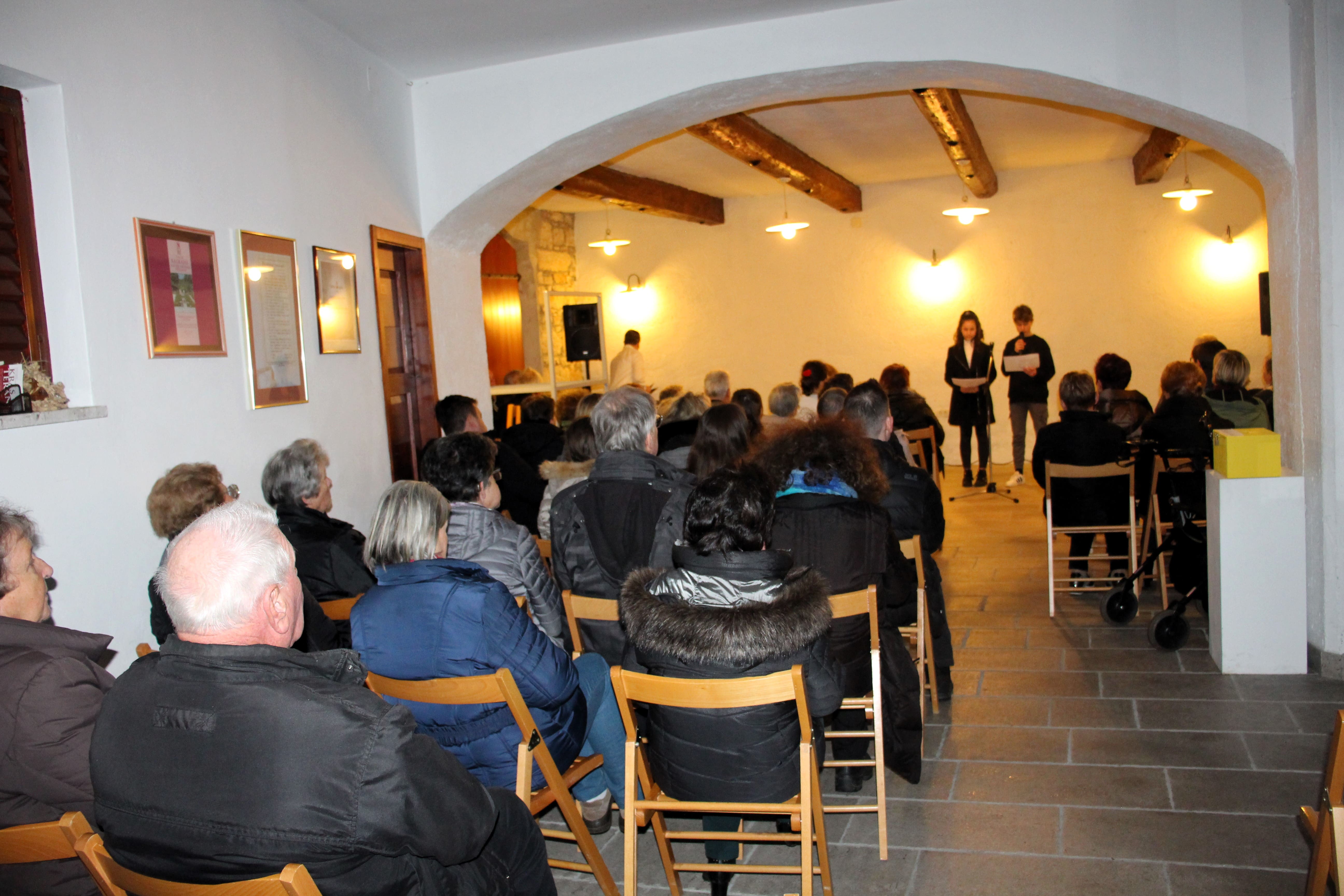 Prvi del dogodka je potekal v dvorani v Bunčetovi domačiji s predstavitvijo odkritja freske škofa Piccolomini-ja, poznejšega papeža Pij II. Zanimivo pripovedovanje ga. Duje Marie Kaucic o odkritju freske pred več kot 20 leti se je prepletalo s petjem domače moške vokalne skupine društva Venček.