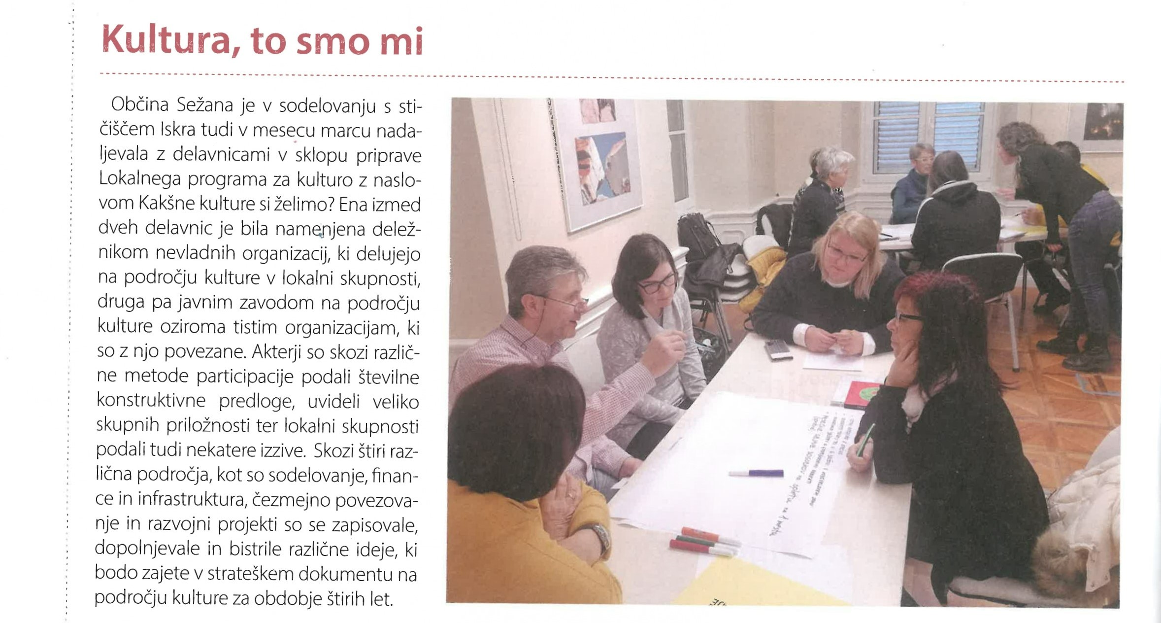Občina Sežana nadalje izpostavi, da so v bile v ta namen v sodelovanju z javnimi in drugimi zavodi ter nevladnimi organizacijami na področju kulture v občini Sežana, izvedene delavnice z naslovom »Kakšne kulture si želimo?«. V strateškem dokumentu omenjajo 3 delavnice, v Kraškem obzorniku 2 delavnici. V ta namen je občina sodelovala s Kulturno izobraževalnim društvom PINA iz Kopra– ki je, kot pravijo- stičišče za nevladne organizacije obalno-kraške regije in predstavlja podporno okolje ter skrbi za skladen razvoj nevladnega sektorja na tem območju.