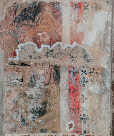 Ob odstranitvi spovednice zaradi njene obnove se je na levi strani portala pokazala figurativna poslikava, delno odkrita izpod beležev. Ob ogledu se je pokazalo, da gre za zelo kvalitetno freskoposlikavo, verjetno iz sredine 15. stoletja. Na vidnem kosu freske so od leve proti desni upodobljeni bradat in dolgolas cesar, mladenič in papež, za njimi pa je delno viden mož s pokrivalom.